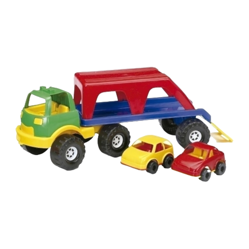 Transportador con 2 autos y una cabina con rampa desplegable para carga y descarga. ¡Conduce este gran camión y ayuda al conductor a realizar su entrega!