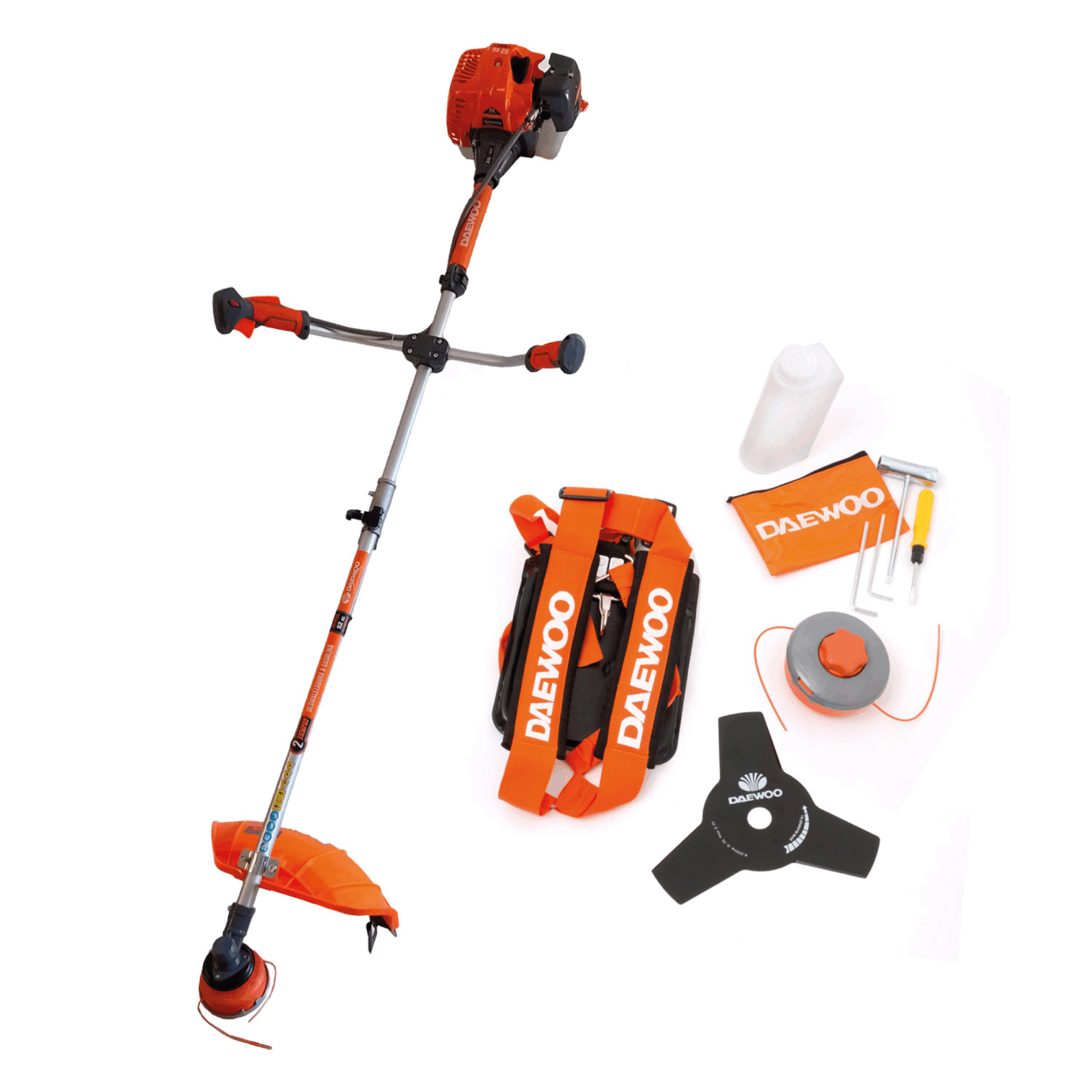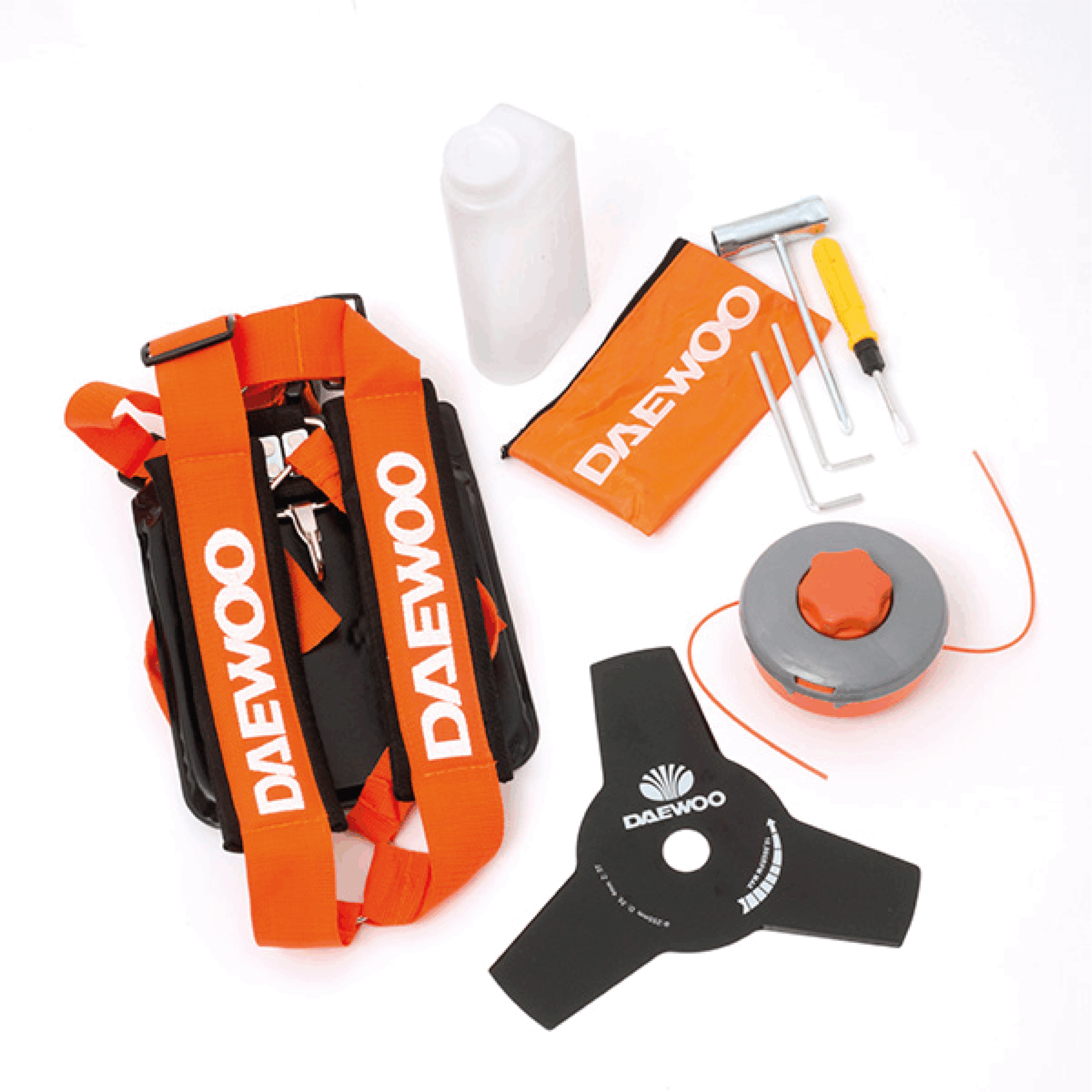 - Incluye: Botella mezcla combustible, cuchilla 3T+tanza de nylon; protector de césped; arnés de hombro doble y kit de herramientas.
